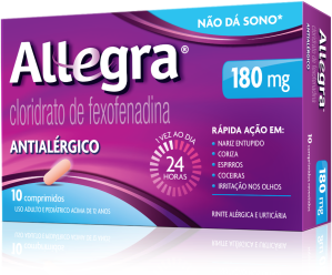O Allegra 180mg com 10 comprimidos revestidos é um antialérgico (princípio ativo: cloridrato de fexofenadina) de uso adulto e pediátrico (acima de 12 anos), que alivia rapidamente os sintomas de rinite alérgica e urticária sem causar sonolência.