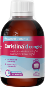O Coristina D Congest Xarope 120ml (sabor uva) é um medicamento líquido que combina ação antialérgica e descongestionante, indicado para o alívio rápido de sintomas associados a gripes, resfriados, rinite e sinusite.