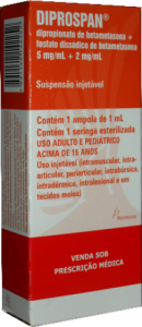 O Diprospan (caixa com 6 ampolas de 1ml) é um medicamento injetável potente que combina dois tipos de betametasona para oferecer um efeito imediato e, ao mesmo tempo, prolongado (depot).